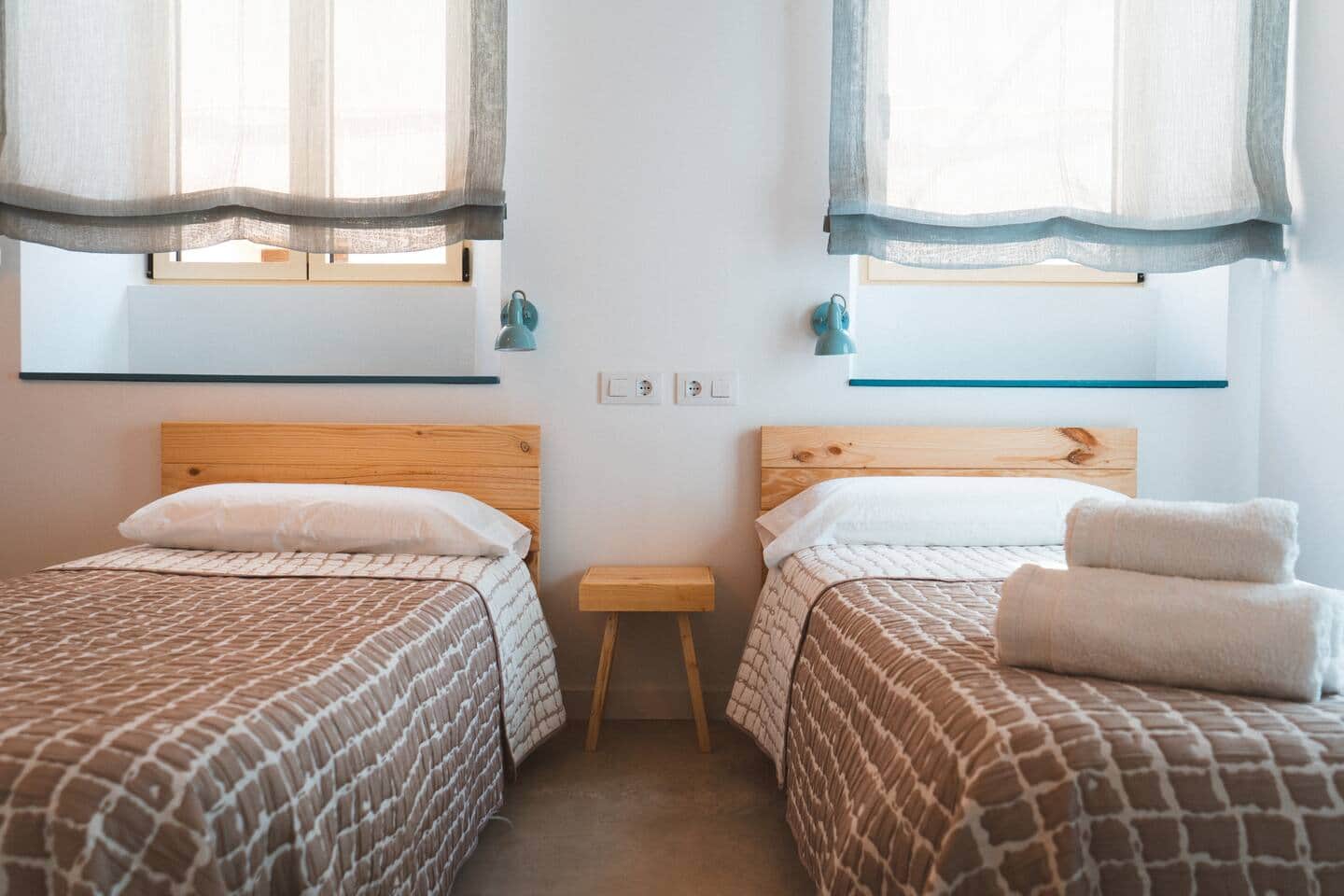 Just entrar a casa ens trobem al pati, on hi ha una taula amb dues cadires. En la mateixa planta hi trobem dues habitacions que tenen sortida al pati. A l'habitació de matrimoni hi ha un llit doble, un armari i dues tauletes de nit. I a l'altra habitació hi ha dos llits individuals, un armari i una tauleta de nit al mig. Al costat hi trobem el bany, que disposa de dutxa, bàter i pica, i també hi ha un petit quartet amb la rentadora i assecadora.